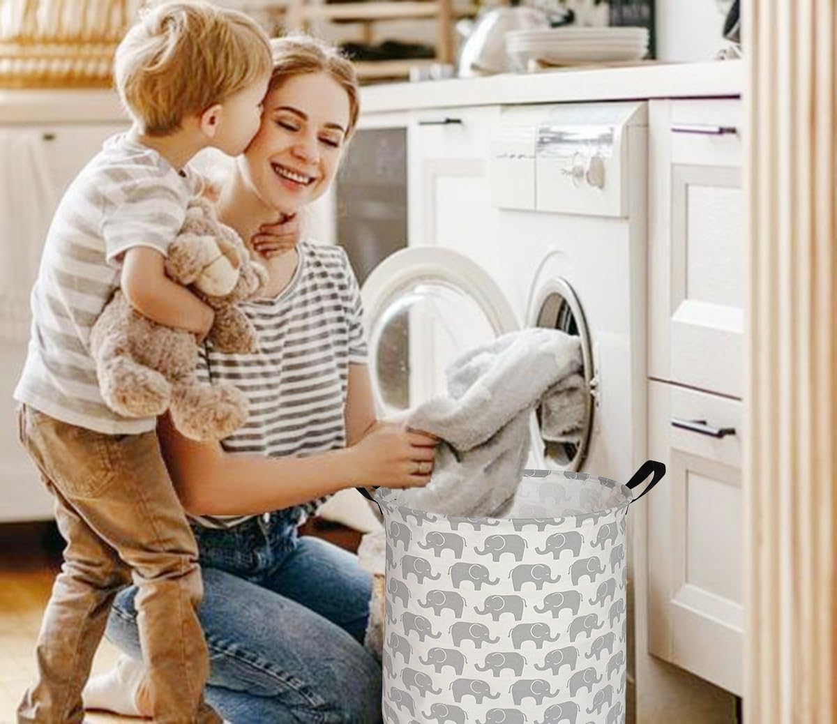 19.7 Inches Laundry Hamper Toys Box Storage Bins Canvas Waterproof Collapsible Clothes Organizer Basket with Handle Freestanding Large Cute Light Weight for Home Kids Baby Room (Grey Elephant)