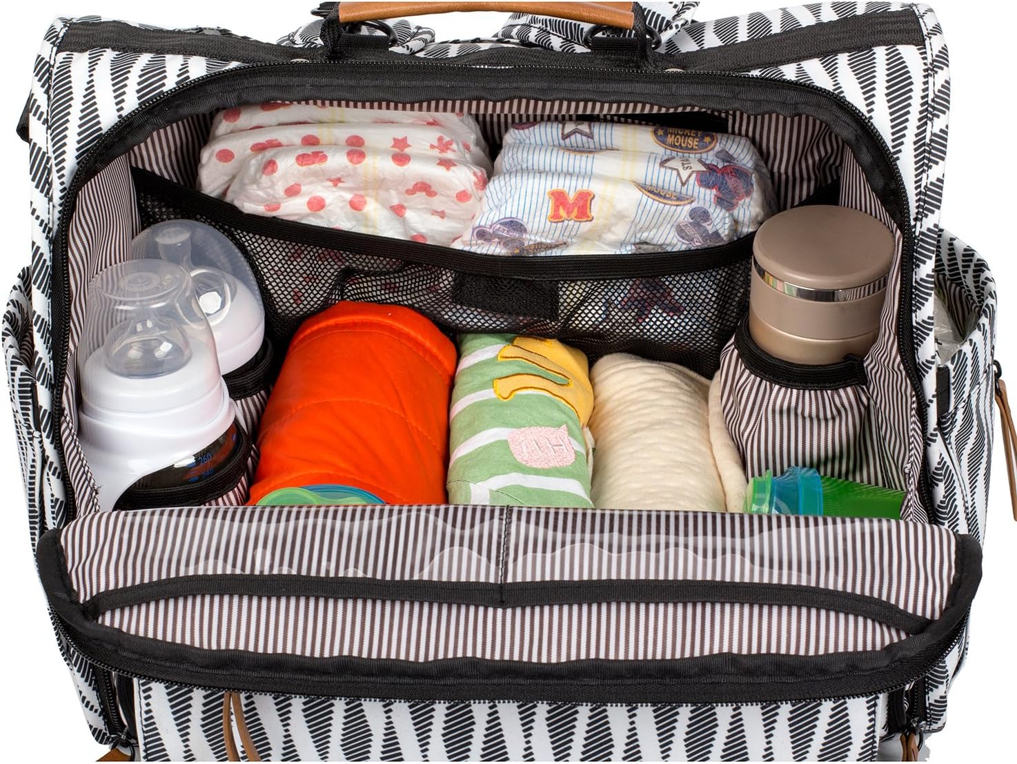 Customers find this diaper bag excellent, particularly appreciating its size that accommodates two babies, and its spacious design with multiple compartments. They like its style, especially the striped pattern, and consider it good value for money. The durability and zipper opening receive mixed feedback – while some find it durable and convenient to open, others report issues with straps breaking within three uses and zippers coming undone from the main pocket.