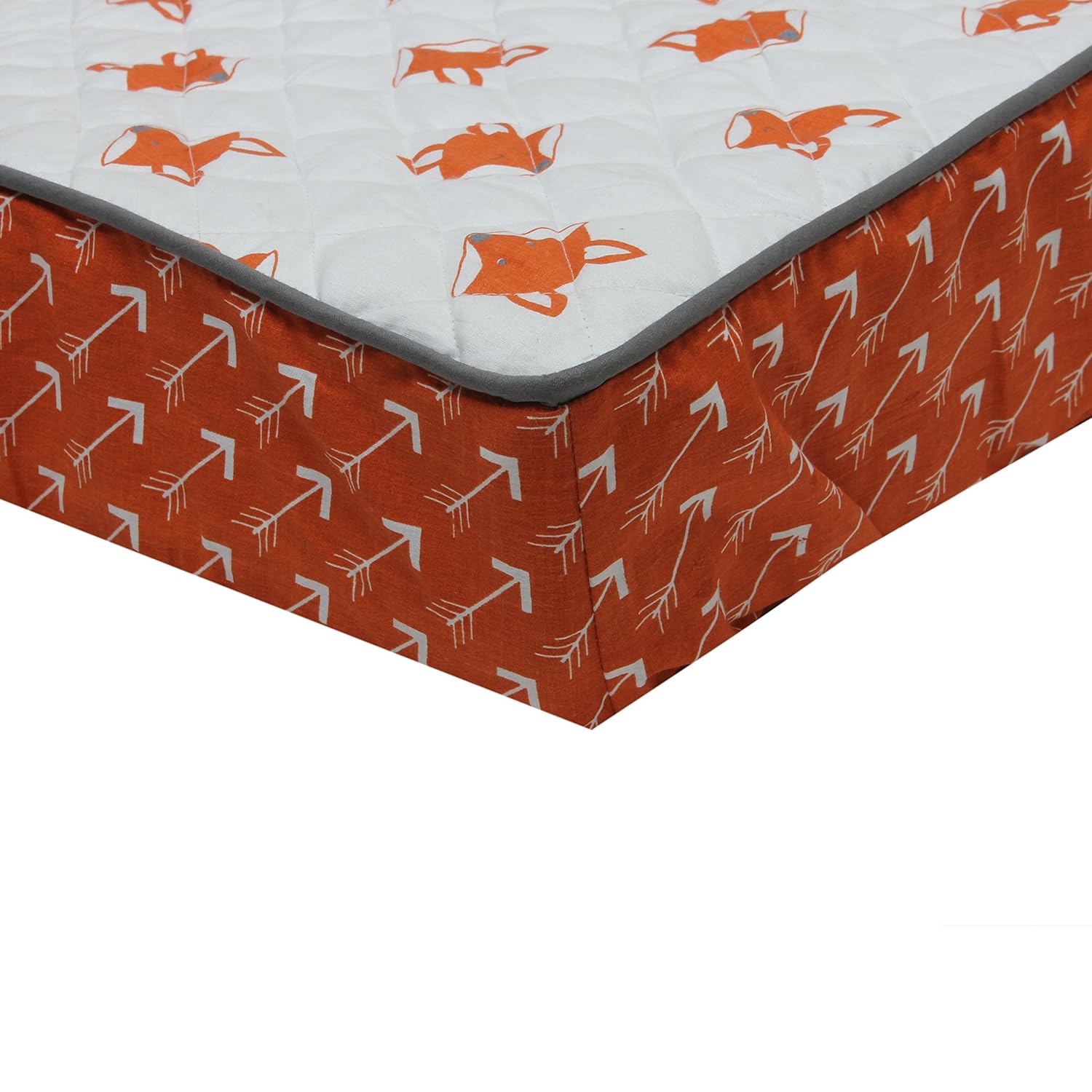 Ensure that your little one stays comfortable and secure with super soft Bacati – Playful Foxes orange/grey Changing Pad Cover. It is made with 100% cotton quilted cotton fabric on top with soft Polly fill to support and cushion your child while you change her diaper. It is accentuated with grey chording with pin stripes gusset. It fits all standard changing pads. It is machine washable and gets softer with every wash. It is made from 100% cotton with poly fill. Size: 16 x 32 x 6 inches. It can be coordinated with Bacati – Playful Foxes orange/grey Bedding Collection. Cotton is a green fabric as it is renewable resource & biodegradable. Cotton is breathable making it more comfortable in extreme climates. Cotton is inherently soft delicate on skin of babies, durable & user friendly. Cottons gentle quality makes it appropriate for Babies with very sensitive skin or skin allergies.