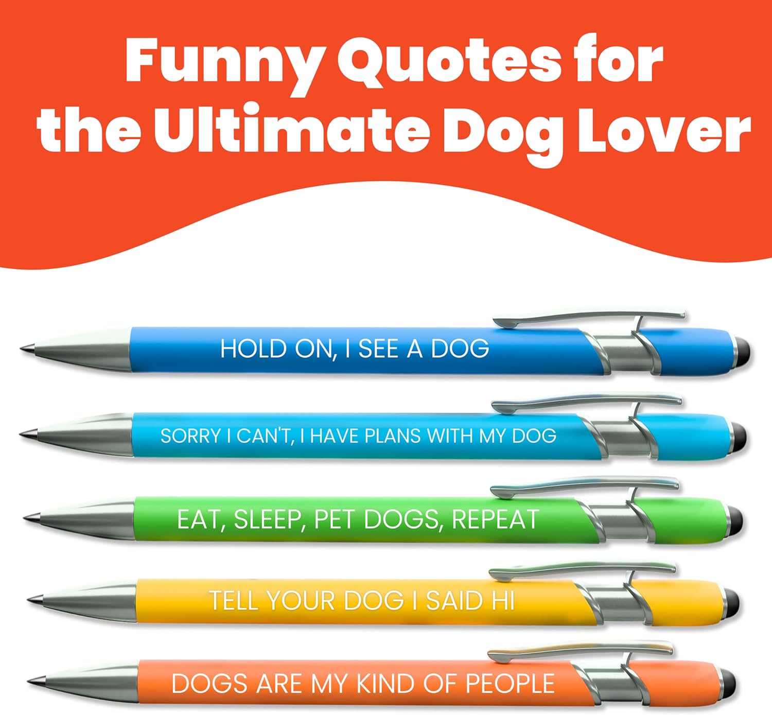 Customers find this pen set to be a nice gift for dog lovers, particularly for dog walkers, and appreciate its cute dog-themed design and bright colors. The pens write well, and customers love the phrases on them, with one describing them as hilarious.