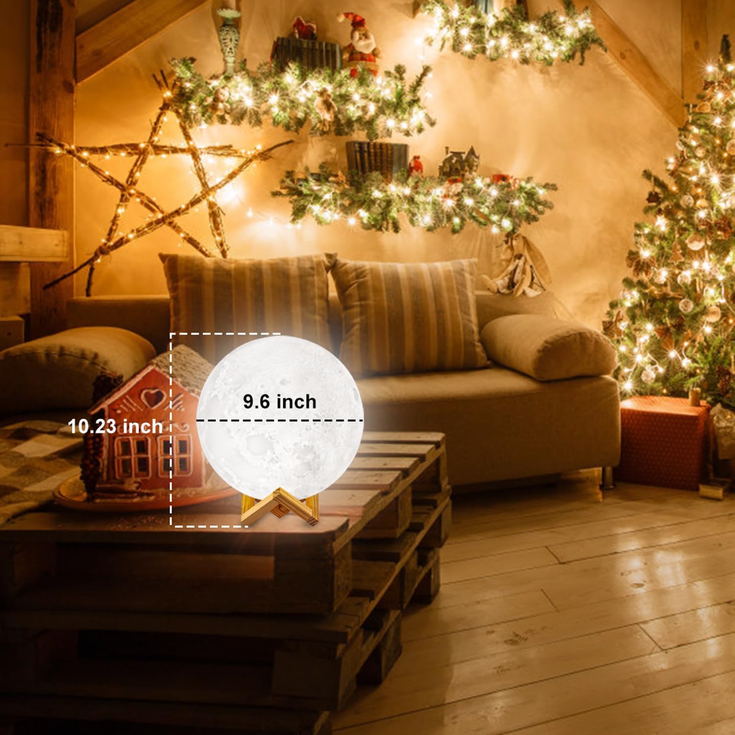 Moon lamp with the diameter is 9.6 inch, made with 3D printing technology, realistic full moon shape, the surface of the moon lamp is very close to the lunar moon, novelty and charming.