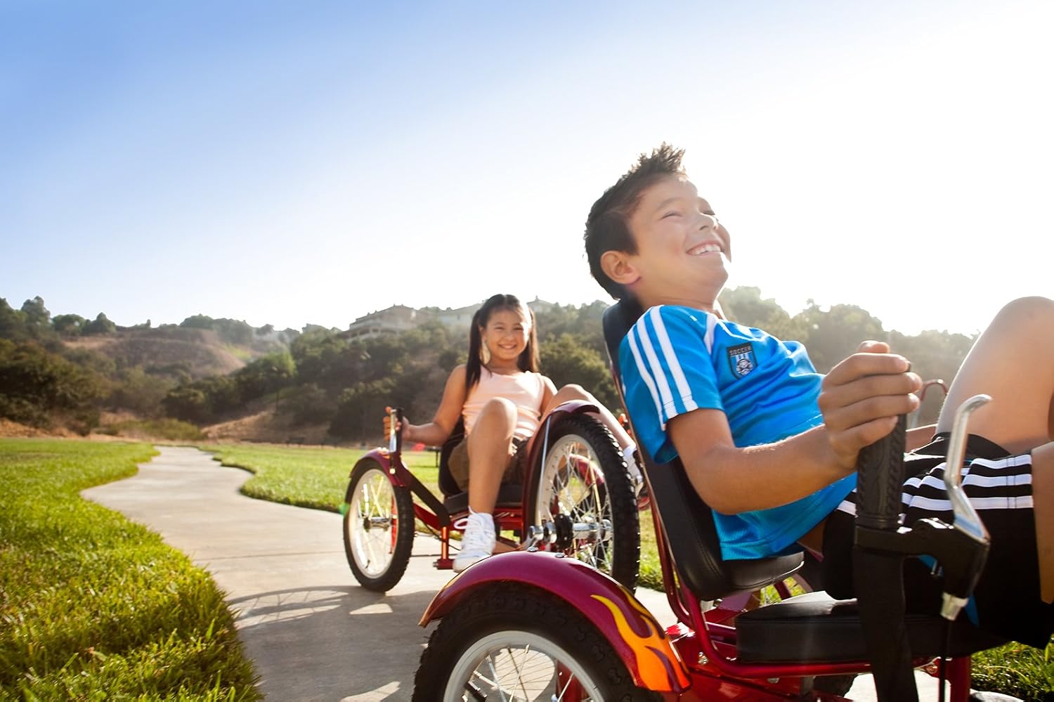 Ride with confidence! Low center of gravity on this youth recumbent bike provides unprecedented stability. No balance required. Dual-joystick steering offers smooth maneuverability with simple hand movements.
