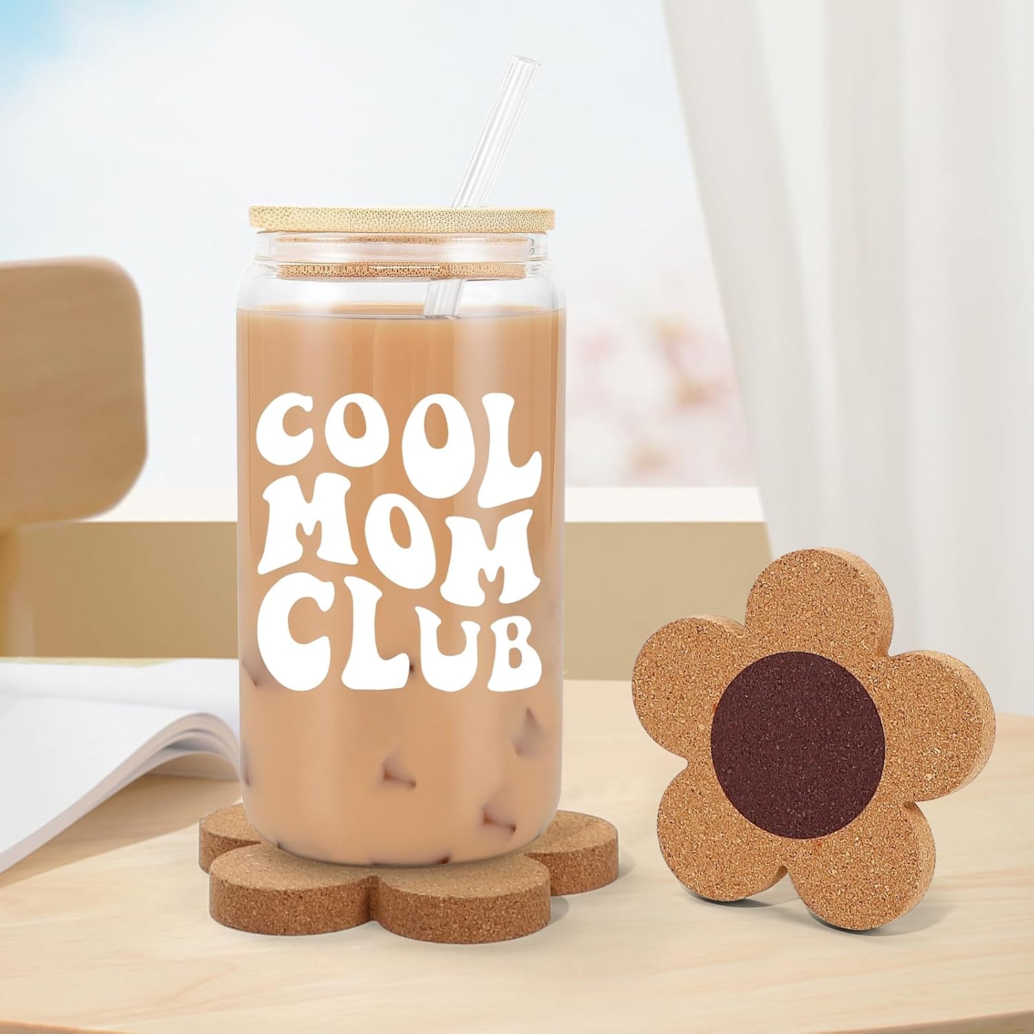 Cool Mom Club Coffee Glass & Flower Cork Coaster – The 16oz coffee glass crafted from thick, high-quality borosilicate glass, transparent and durable, free from lead and BPA, adorned with “Cool Mom Club” design. Includes a lid, brush, straw, and a delightful flower cork coaster measuring 10cm x 10cm x 1cm. Ideal for her delightful coffee moments