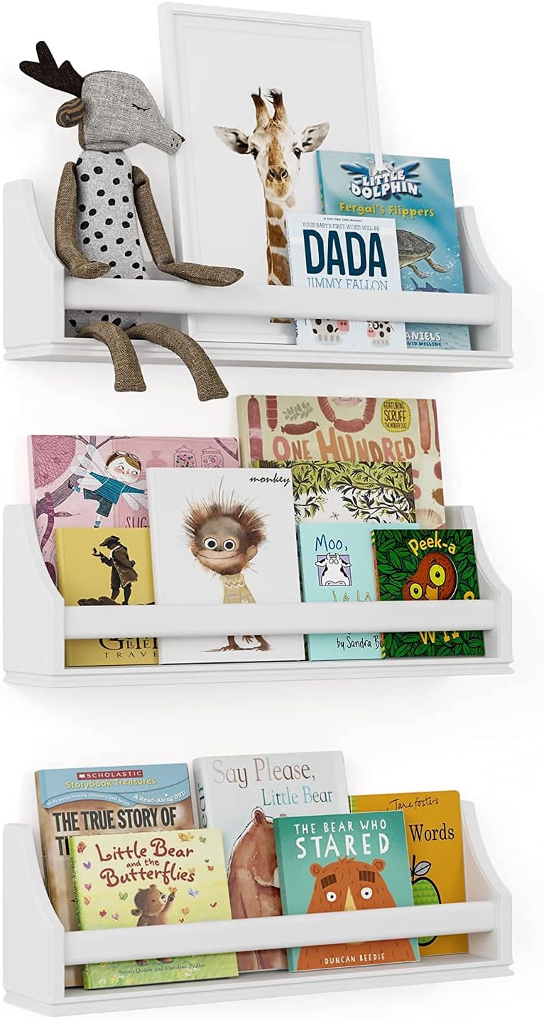 Nursery Décor Wall Shelves – 3 Set Shelf – Crown Molding Floating Bookshelves for Baby and Kids Room Book Organizer Storage Ledge, Display Holder for Toys, CDs, Baby Monitor, Frames