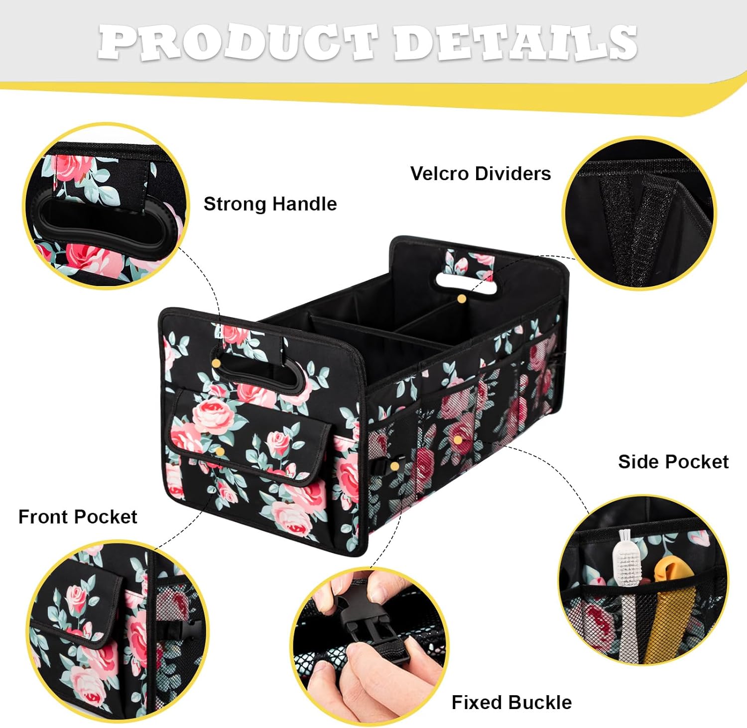 FOLDABLE CAR ORGANIZER: The car storage organizer can be shrunk or unfolded to fit in the trunk, perfect for business trips travel and supermarket shopping. It can be folded to half length and used as a seat organizer. It can be collapsible completely when not needed and secured with buckle, not easy to fall apart and easy to store.