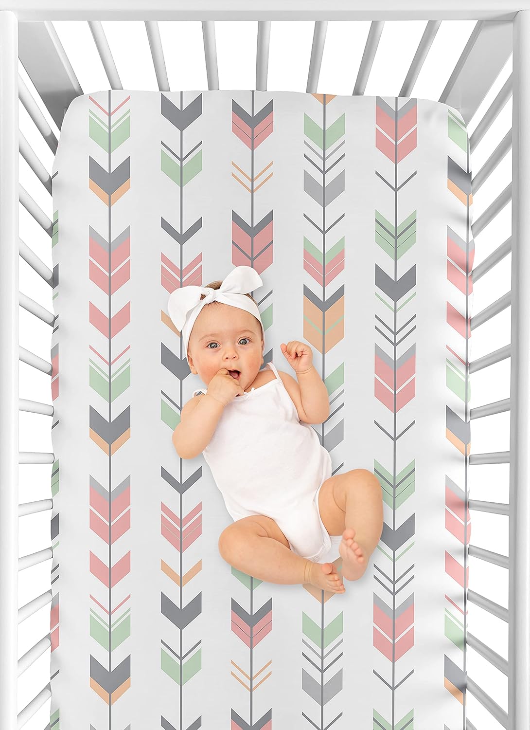 This brushed microfiber crib sheet features an exclusive design of a coral, mint, and grey arrow print.